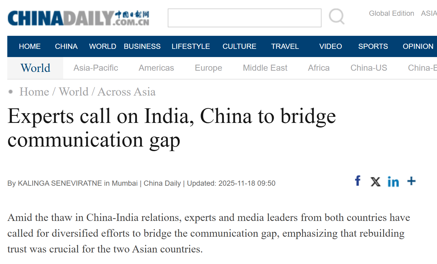 2025年10月9日,本院纪莉教授受邀参加了在印度孟买举办的第31届亚洲媒体信息与传播中心(AMIC)年会,并做主题发言。AMIC成立于1971年,长期致力于亚太地区媒体与传播研究,是该地区最早专注于传播议题的国际组织之一。此次年会主题为“构建亚洲国家间的沟通桥梁”。纪莉教授在发言中提出亚洲的可持续发展传播研究,可以为亚洲国家减少对抗性传播叙事,共同推动亚洲可持续发展发挥有价值的作品。该观点得到《中国日报》报道。