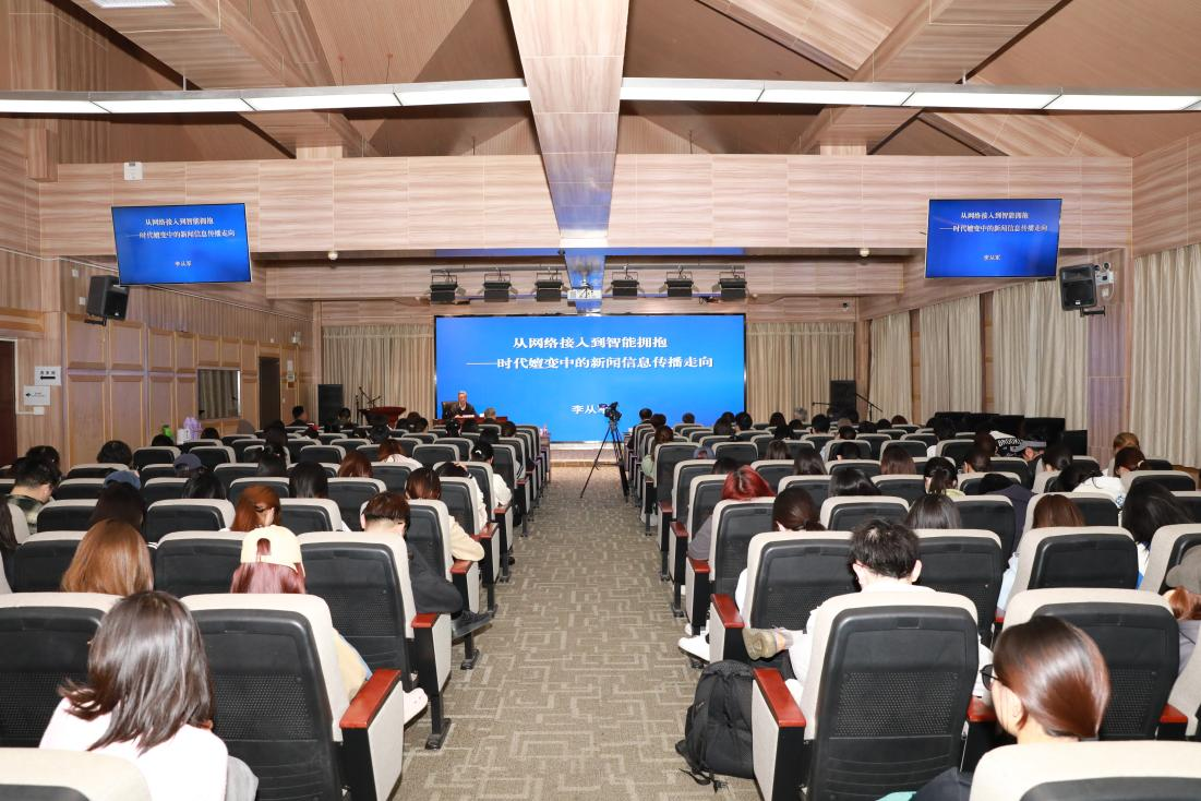 会后,李从军在新闻与传播学院举办的“马克思主义新闻观大讲堂暨珞珈卓越新闻传媒人才大讲堂”上,作了题为《从网络接入到智能拥抱——时代嬗变中的新闻信息传播走向》的专题报告。他结合自身新闻战线工作经历及近年对国内外传媒发展的观察研究,从三个方面进行了深入讲述:一是要深刻认识网络时代的大变革。第三次工业革命正深刻改变人们的思维、行为与价值准则。面对网络时代新闻信息传播带来的巨大冲击,主流媒体数字化转型已按下快进键,必须坚持“内容为王”,推动优质内容与高新科技深度融合,做到识变、应变、求变;二是要积极应对人工智能时代的新挑战。人工智能带来的冲击全面而深刻,生成式AI、具身智能与多模态智能体正催生九大传播新趋势。新闻舆论工作要守住算法边界和价值底线,发挥人的关键作用,牢牢把握技术主导权,趋利避害、行稳致远。三是要做新时代合格的媒体从业者。新闻从业者须坚守正确政治立场,不断锤炼“四力”,善用数字技术赋能专业发展。在人工智能浪潮中,更要坚守人的主体性与人文特质,推进人机协同。他勉励武大学子坚守马克思主义新闻观,勇担“船头瞭望者”的时代使命,以创造力为民族复兴贡献力量。